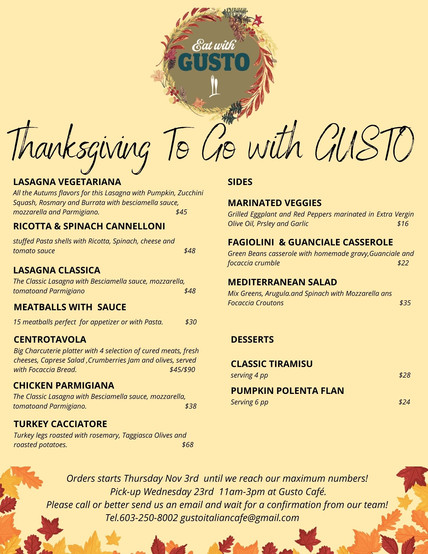With that said, make this Thanksgiving less about being in the kitchen and more being with your friends, families and love ones. Allow us to take the stress of cooking off your should. You still have time to place your order for Thanksgiving To Go With Gusto. Call us at (603) 250-8002 or send us an email at GustoItalianCafe@gmail.com